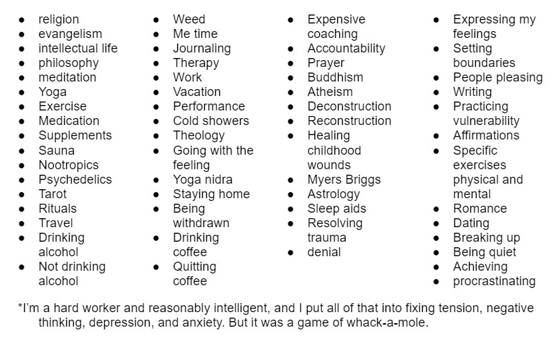 Well, long after I stopped believing the religious stuff, I still had the base layer of conditioning: hypervigilance. In particular, I was taught to be hypervigilant over my thoughts and inner life. If I wanted this nice feeling–and who doesn’t want to feel never ending joy?–I needed to watch my mind.